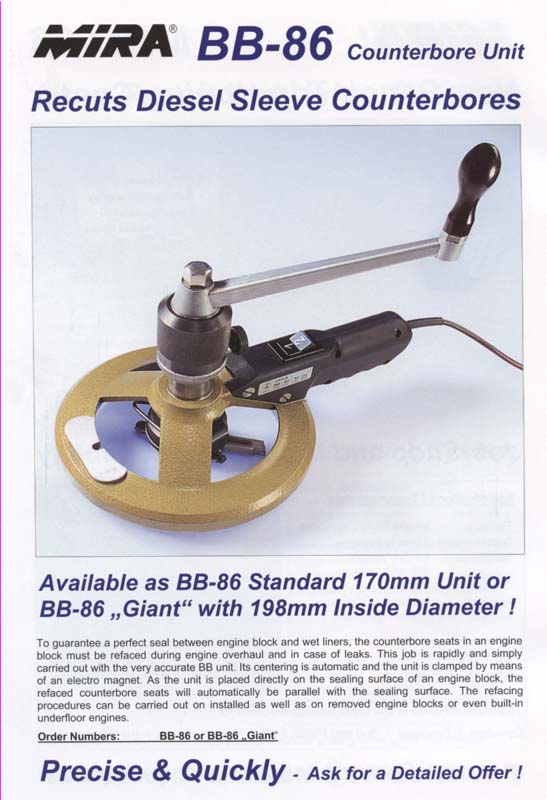The MIRA BB-86 is a fully portable and simple to operate tool to recut Diesel sleeve counterbores. The BB-86 is placed directly on the sealing surface of the engine block. Centering is semi-automatic and the unit is clamped by means of a strong electromagnet. Refacing can be carried out on installed as well as on removed engine blocks or even built-in underfloor engines.